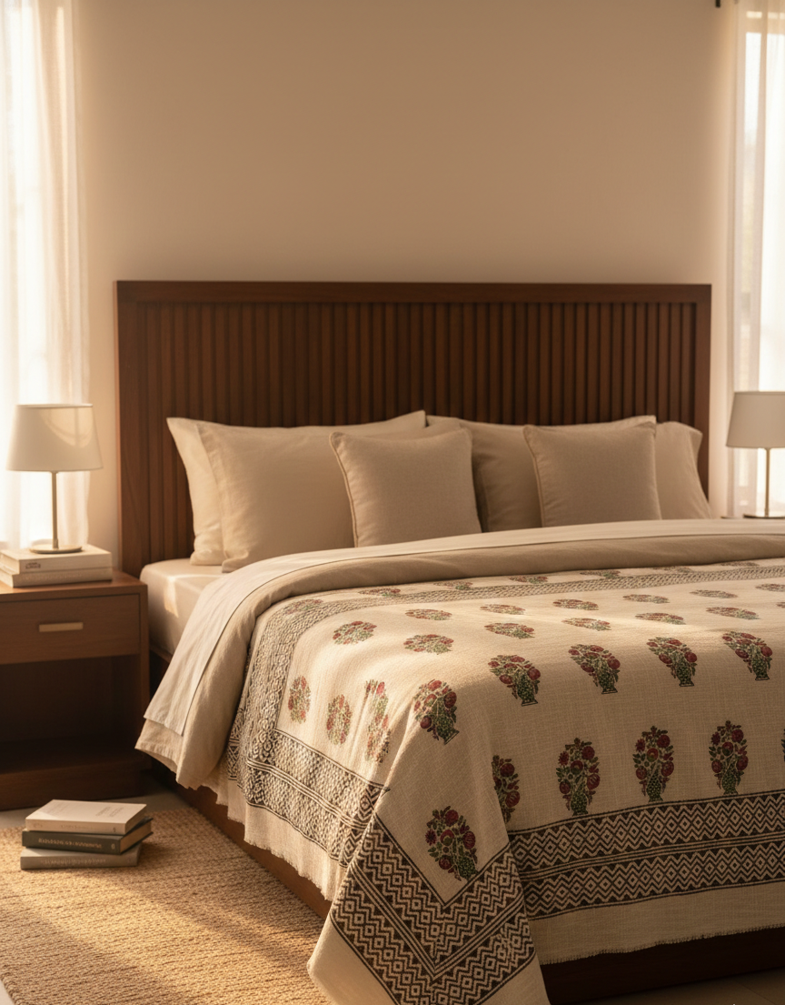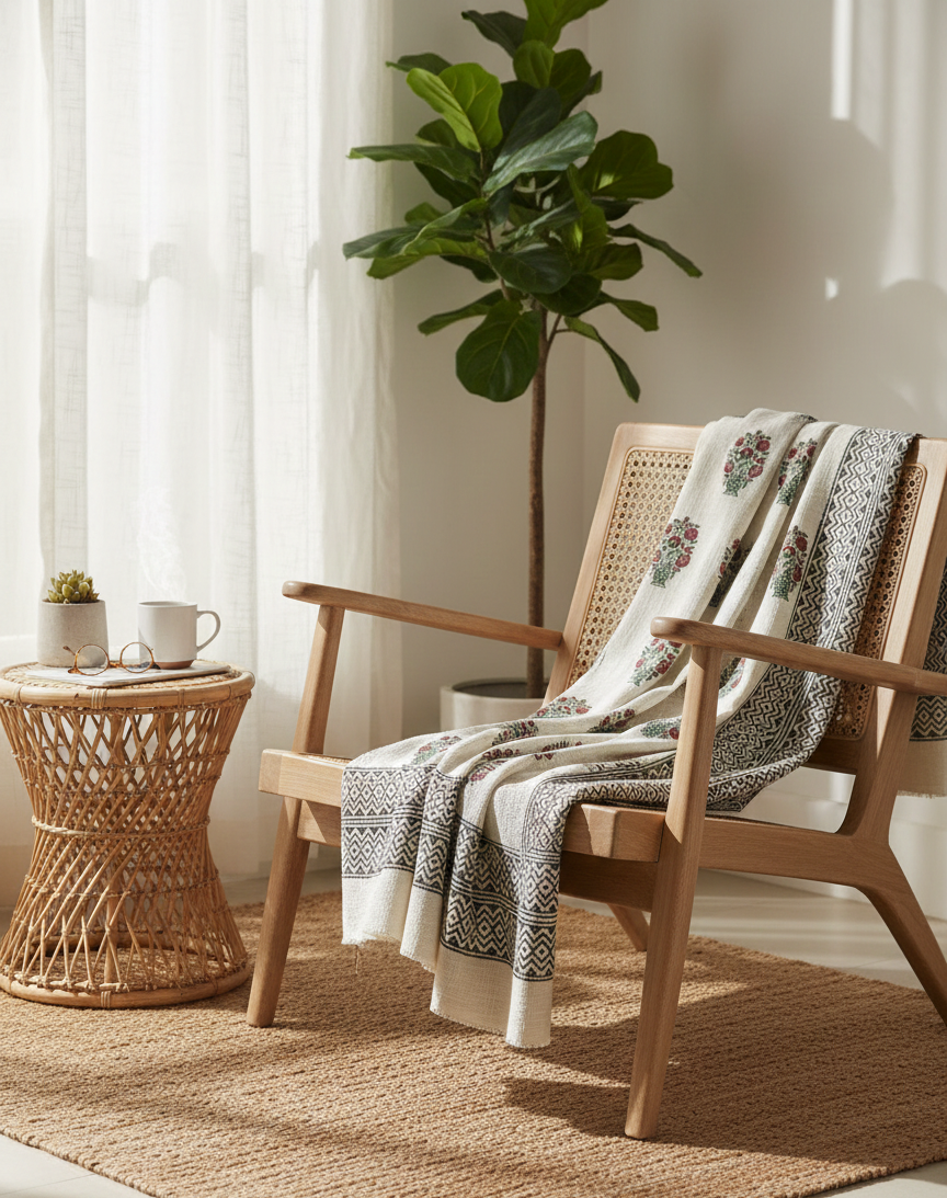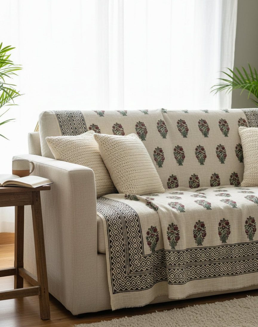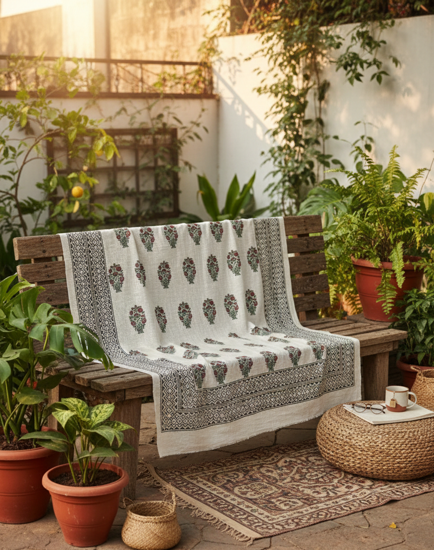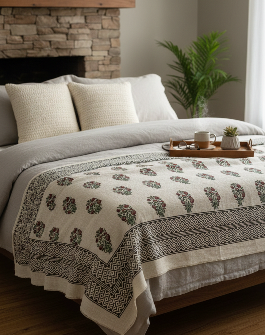 Wrap your space in artisanal warmth with our Handmade Block Printed Cotton Throw Blanket, exclusively designed in London and crafted in Jaipur, India. Each piece is hand-dyed and block printed by local artisans using traditional techniques passed down through generations.