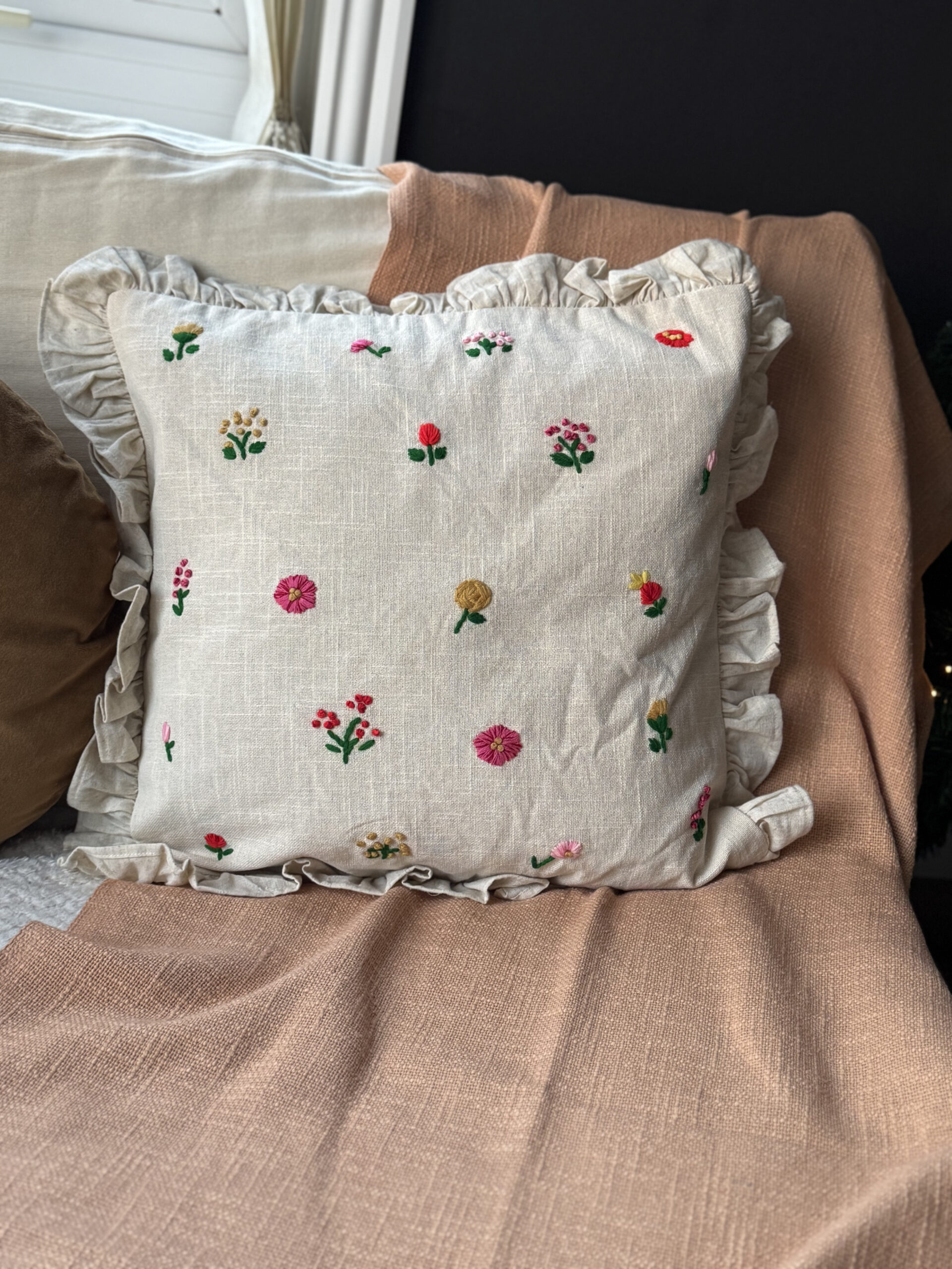 Hand-Embroidered Meadow Ruffle Cushion Cover