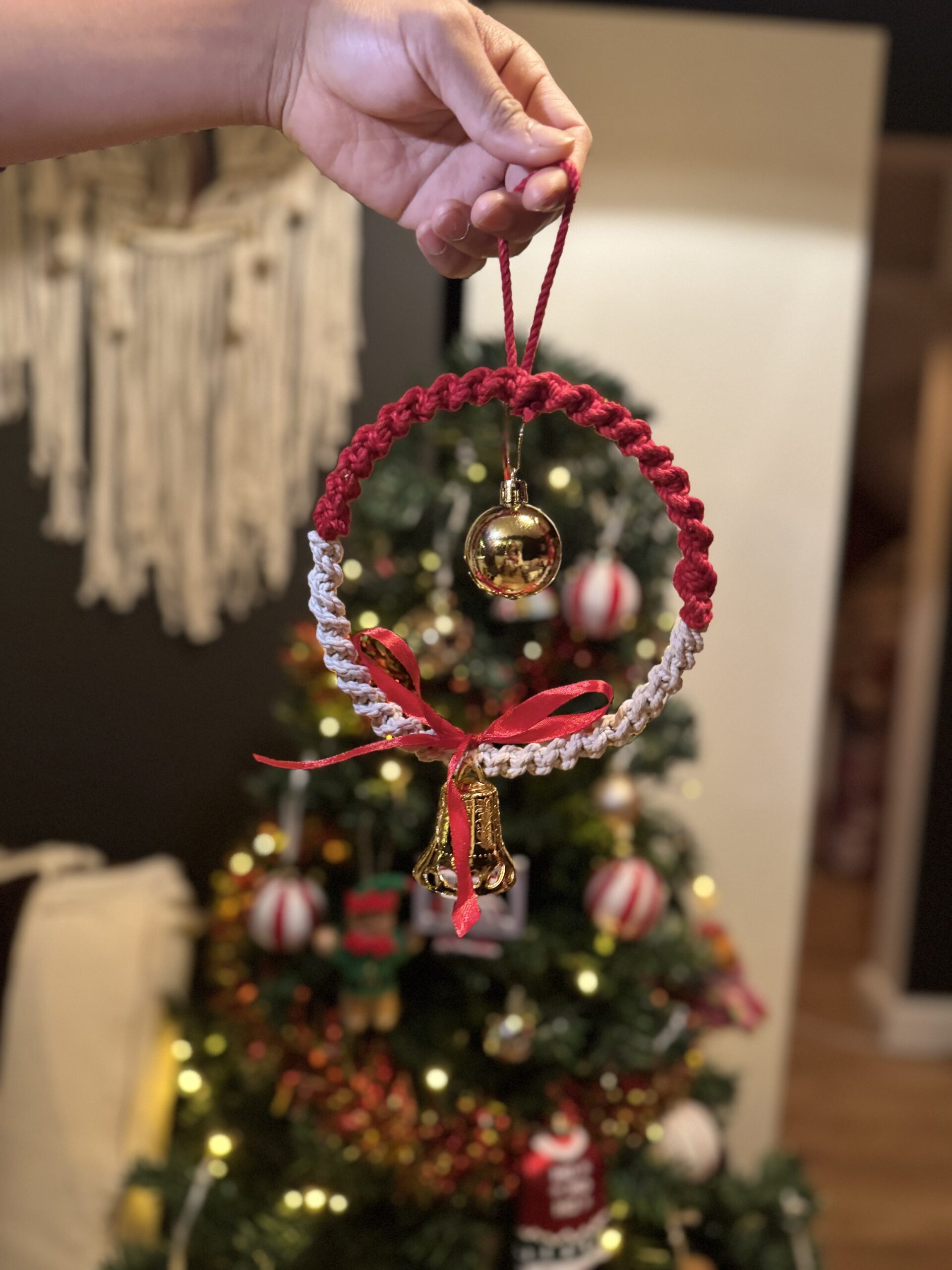 • Materials: 100% Cotton Macrame Cord, Gold Metal Bell, Gold Plastic Ornament.