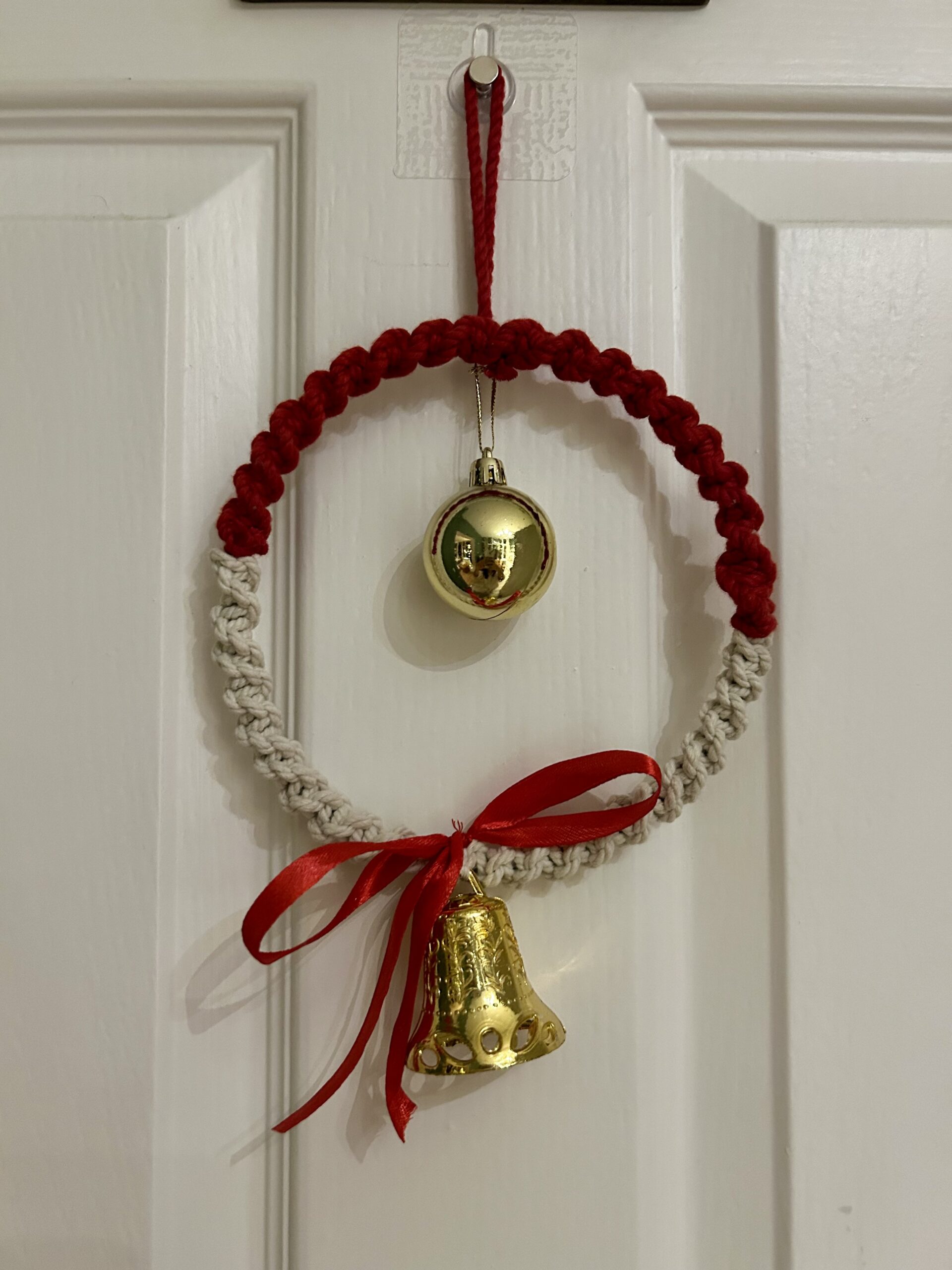 Crafted with soft, premium cotton cord in a classic Christmas red and natural beige pattern, this unique wreath features stunning gold accents. A beautifully knotted red ribbon supports a shiny gold bell and a delicate gold bauble ornament in the center.